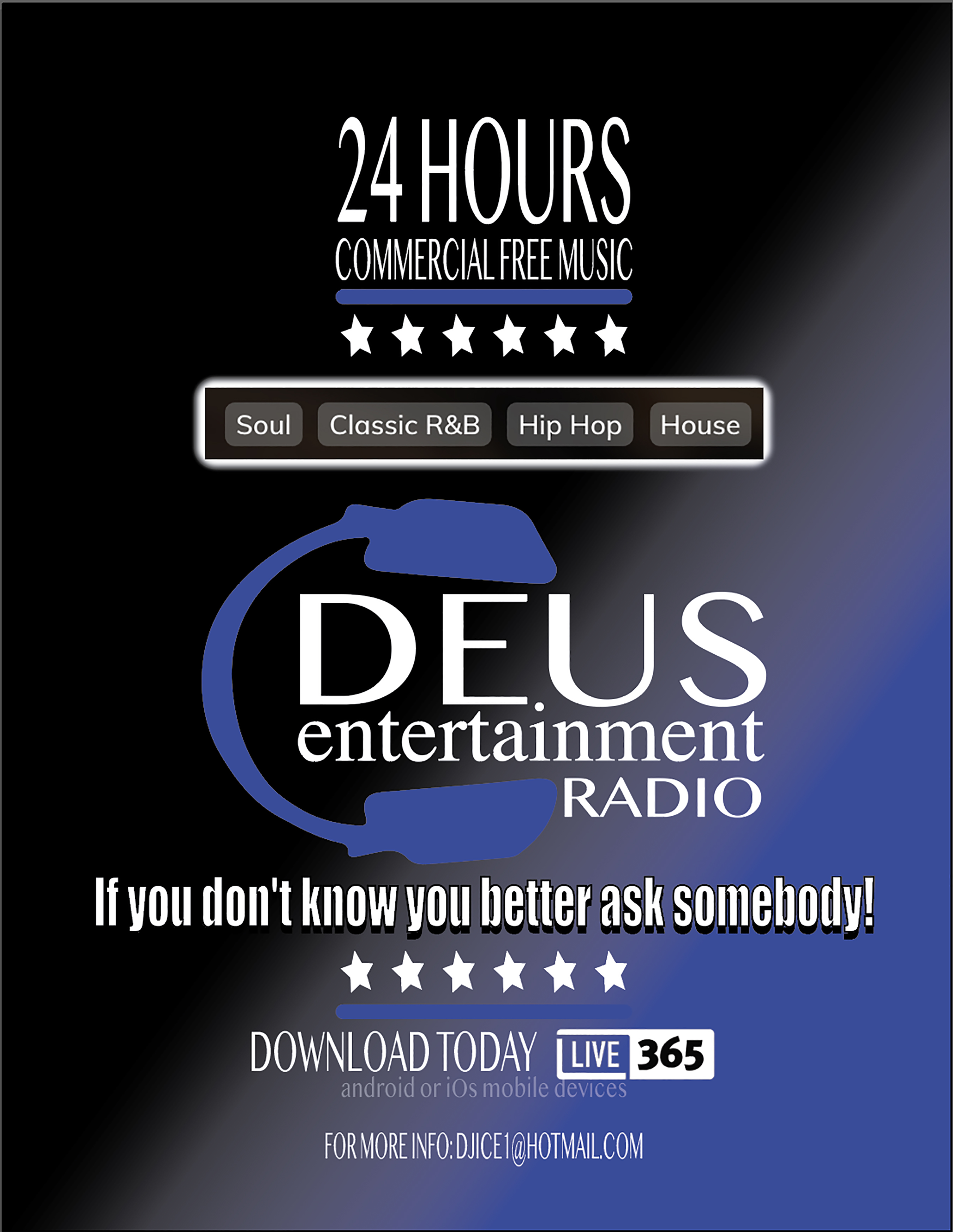 Deus Entertainment Radio is your premier destination for an eclectic and high-energy mix of music. We bridge the gap between eras, bringing you the finest selection of Old School and New School Hip Hop, R&B, and House. Whether you’re looking to groove to soulful Classic R&B, catch the vibes of Afrobeat, or hit the floor with the latest House, Club and Dance hits, we have you covered.