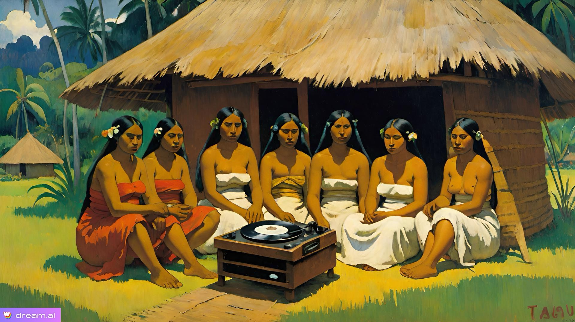 The sounds of a dreamt of, but unrealized, "artists village" in Paul Gauguin's old Tahiti. The Ocean, the jungle, the drums, a gramophone plays an old record, laudanum-inspired visions of an idyllic paradise.