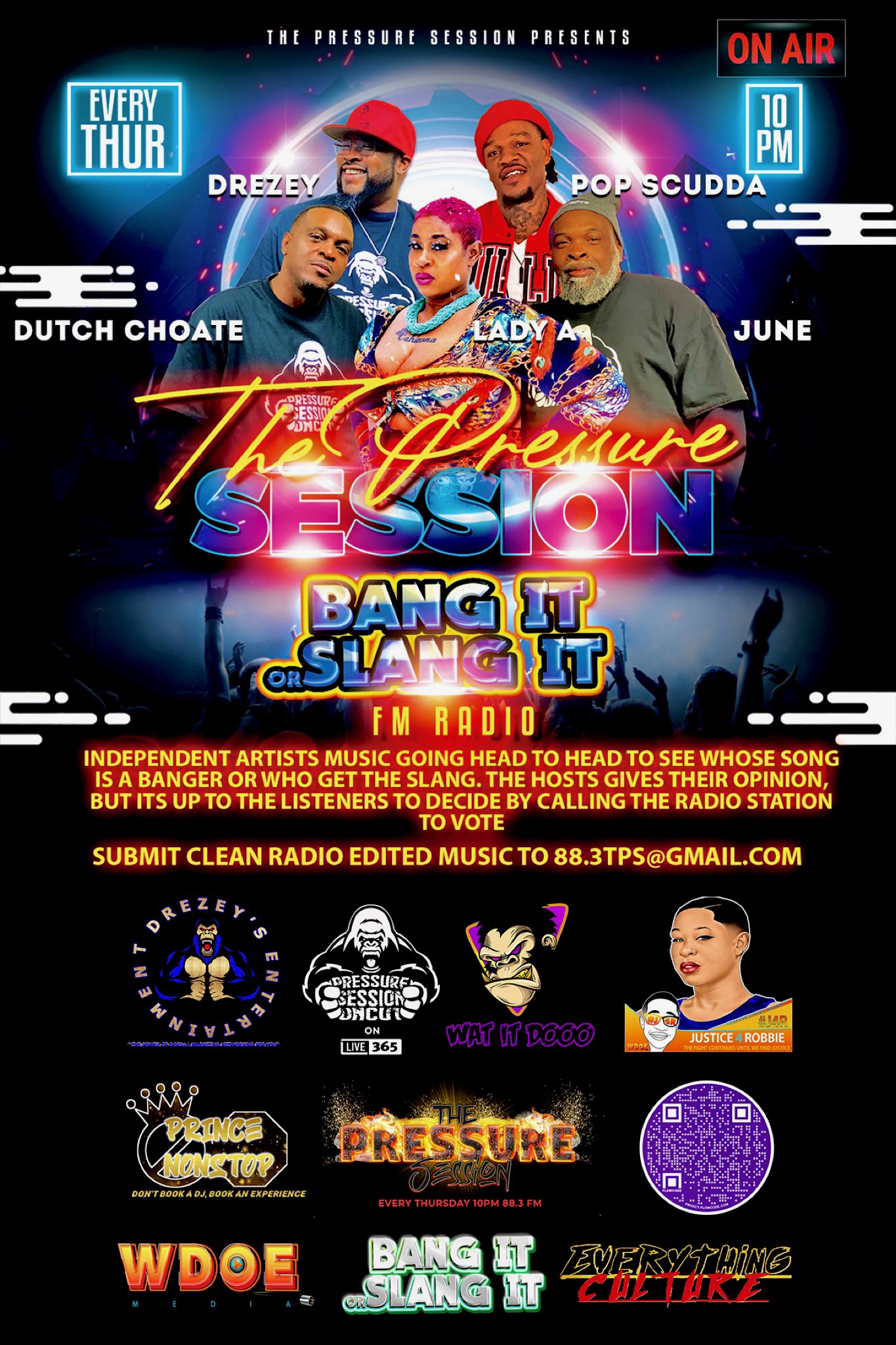 The Pressure Session is a Fm radio station based out of Cincinnati, Ohio that has quickly become a staple in the music community with their show Bang It or Slang it. Hosted by Lady A The Doe, Pop Scudda, O.G Dutch Choate, DreZ, and Big June, the show focuses on providing in-depth interviews with music reviews with both established and up-and-coming artists. What sets The Pressure Session apart from other music interview shows is the connection that the hosts have with their worldwide music community in Cincinnati and beyond. The show is not just about interviewing artists, but also about promoting local and globel talent giving them a platform to be heard. ( Parental Advisory)