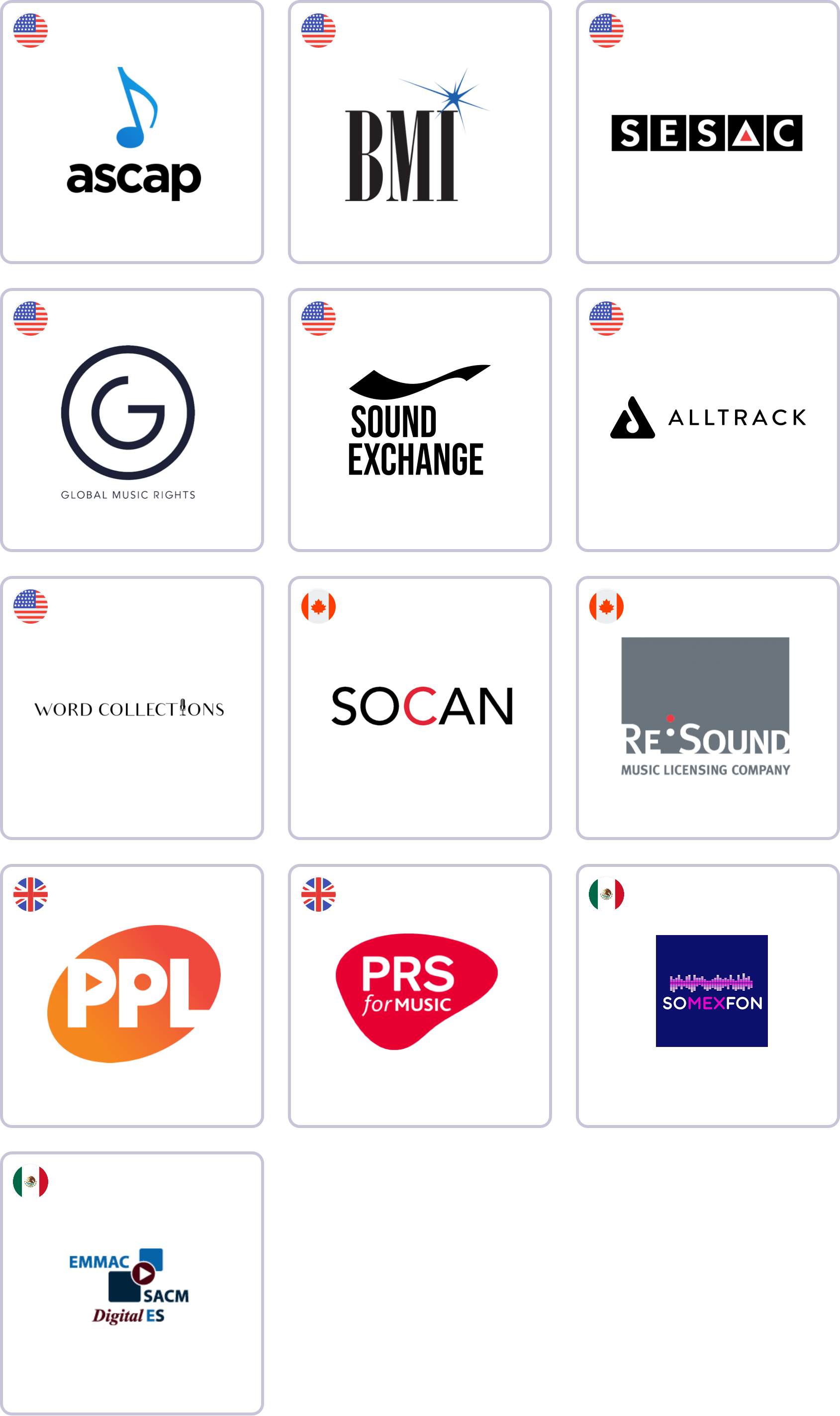 Live365 covers webcast transmissions on Live365 in the US, Canada, Mexico, and UK. The US is covered via ASCAP, BMI, SESAC, GMR, SoundExchange, AllTrack, and Word Collections; Canada is covered via SOCAN and Re:Sound; Mexico is covered via SACM and SOMEXFON; and the UK is covered via PPL and PRS for Music.